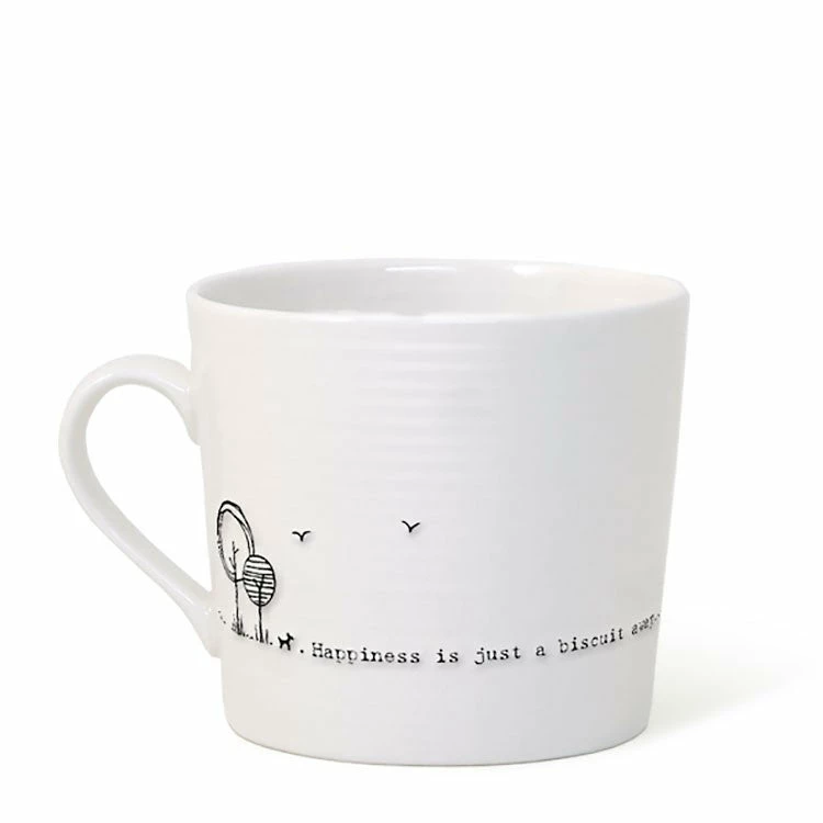 - This mug has the wording, Happiness is just a biscuit away, it also has little pictures