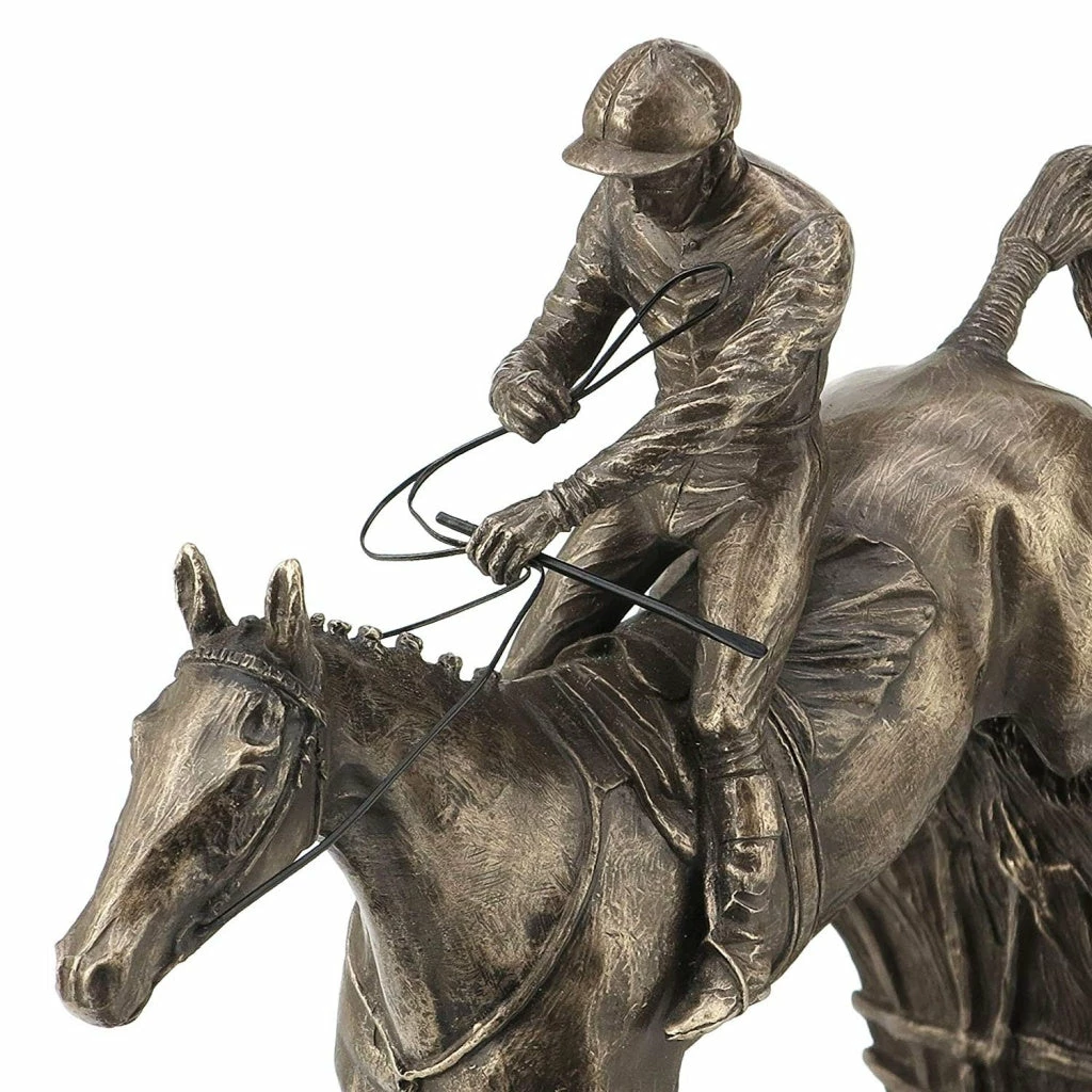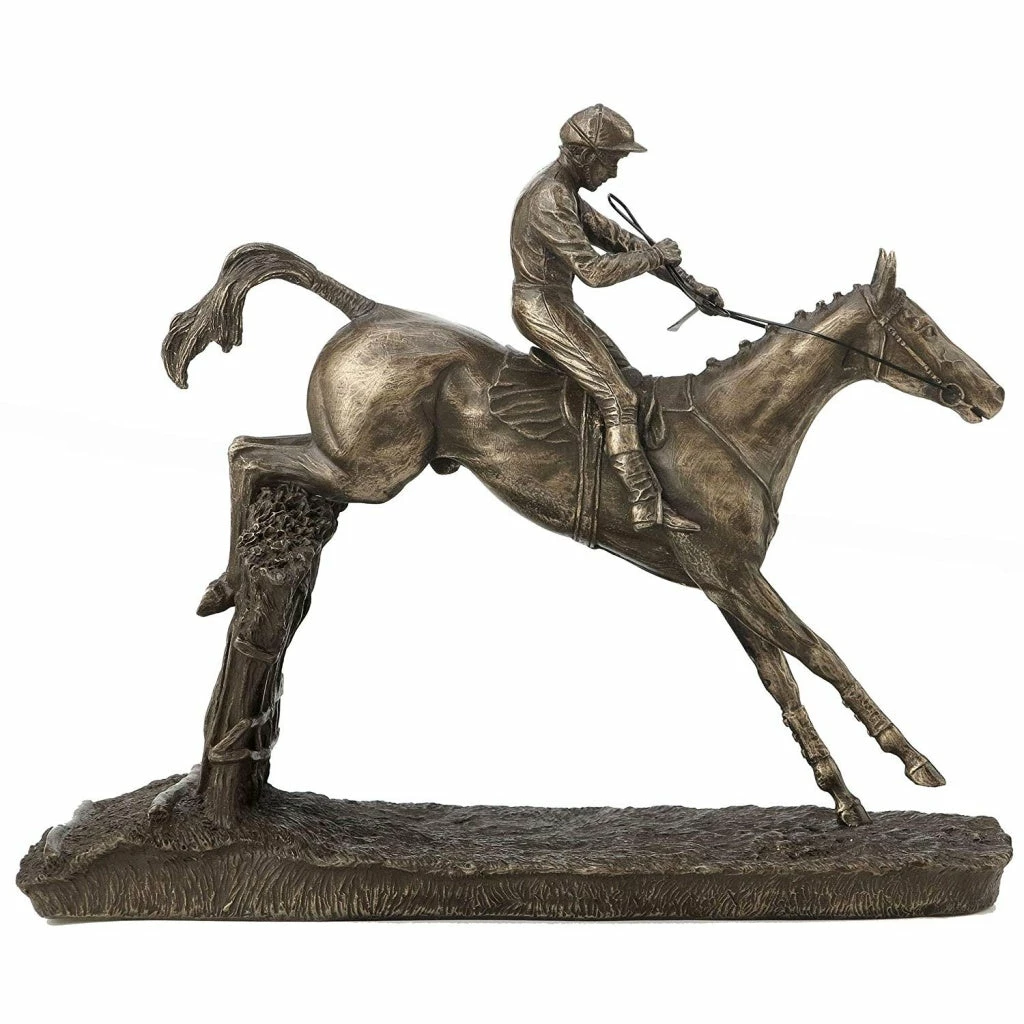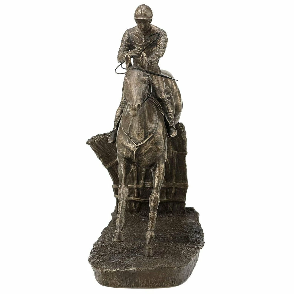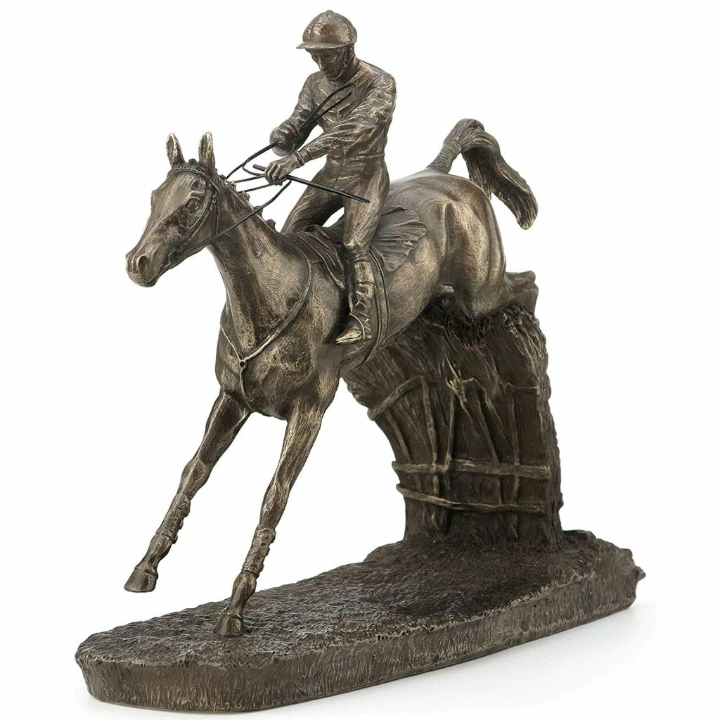 - Cold cast bronze racehorse with jockey jumping the last fence