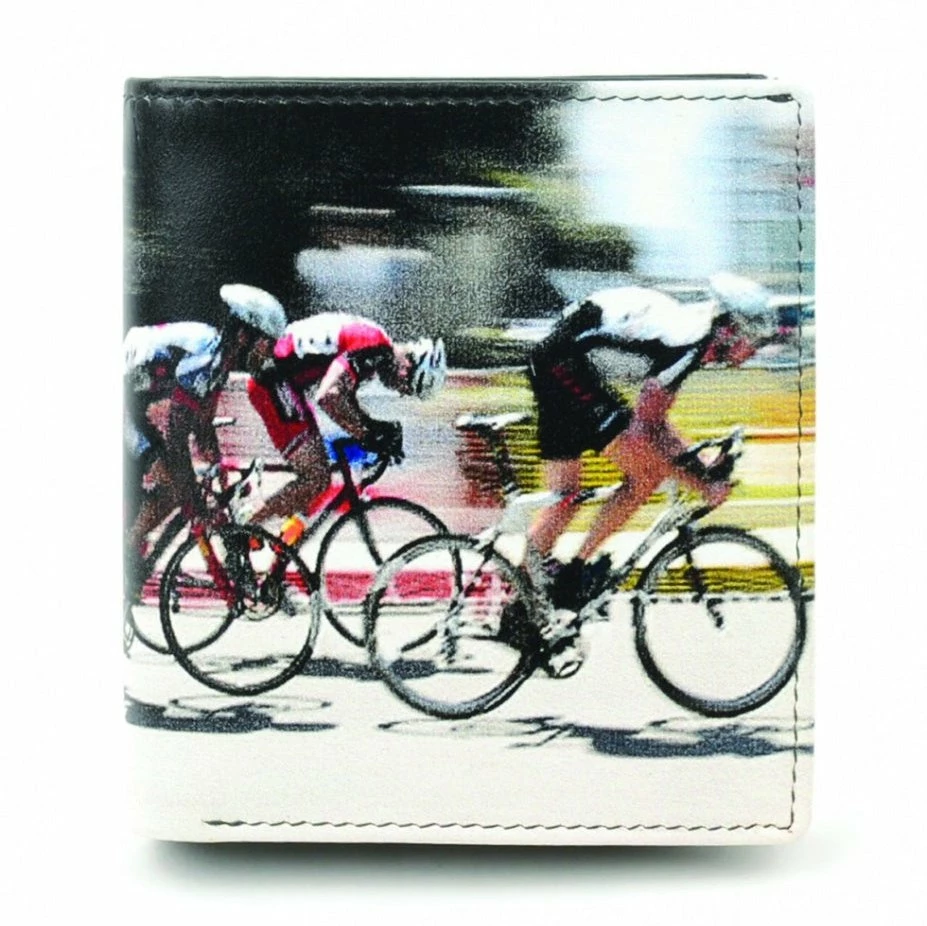 Great quality leather wallet featuring a cyclist design. Comes in a nice gift box and measures around 9 x 10 x 1.8cm (closed) – 25cm span open. The wallet has space for 7 credit cards, 2 note sections a zip pocket and a press stud pouch for coins as well as an ID window.