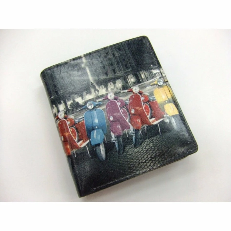 Great retro style mens leather wallet with plenty of space for all your cards and money but an ideal size to fit in your pocket. Design features 5 scooters all in different colours wallet comes boxed and is a lovely quality.