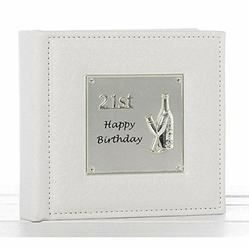 - There is a metal plate on the front of the album with 21st Happy Birthday and a bottle with 2 glasses