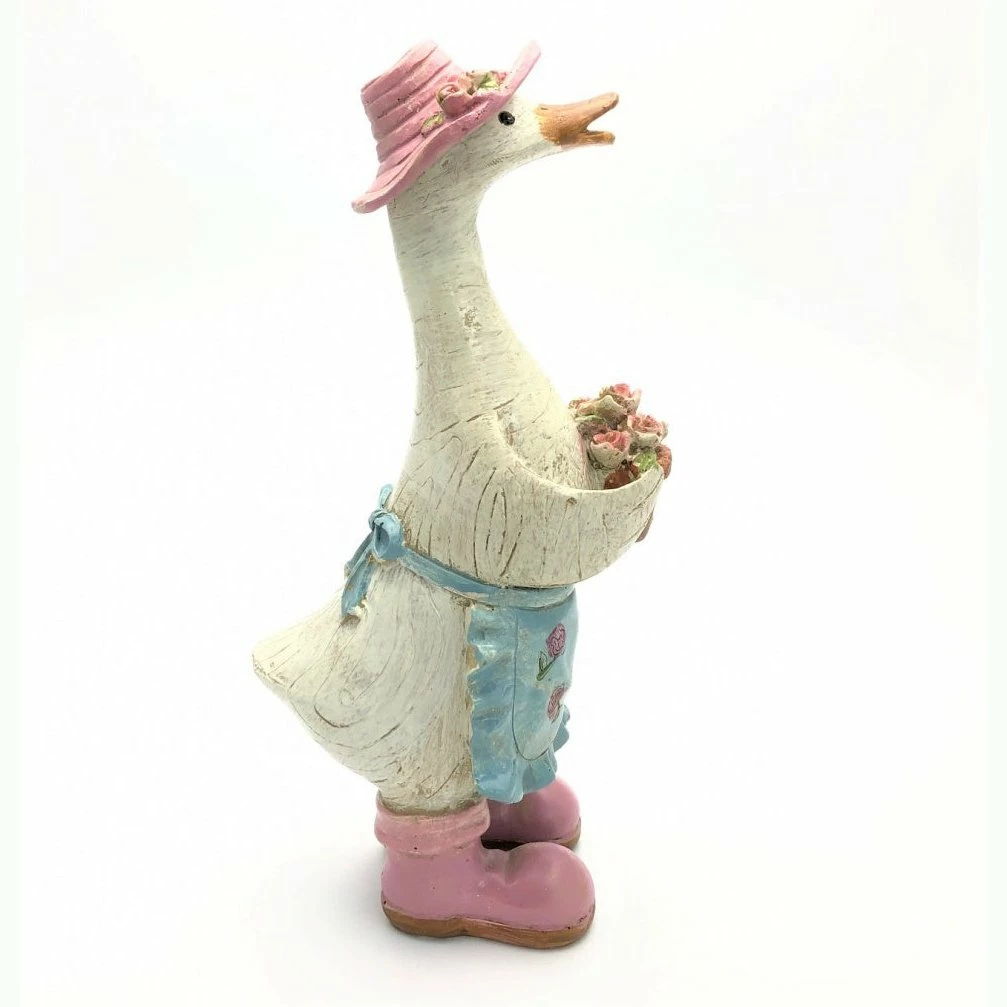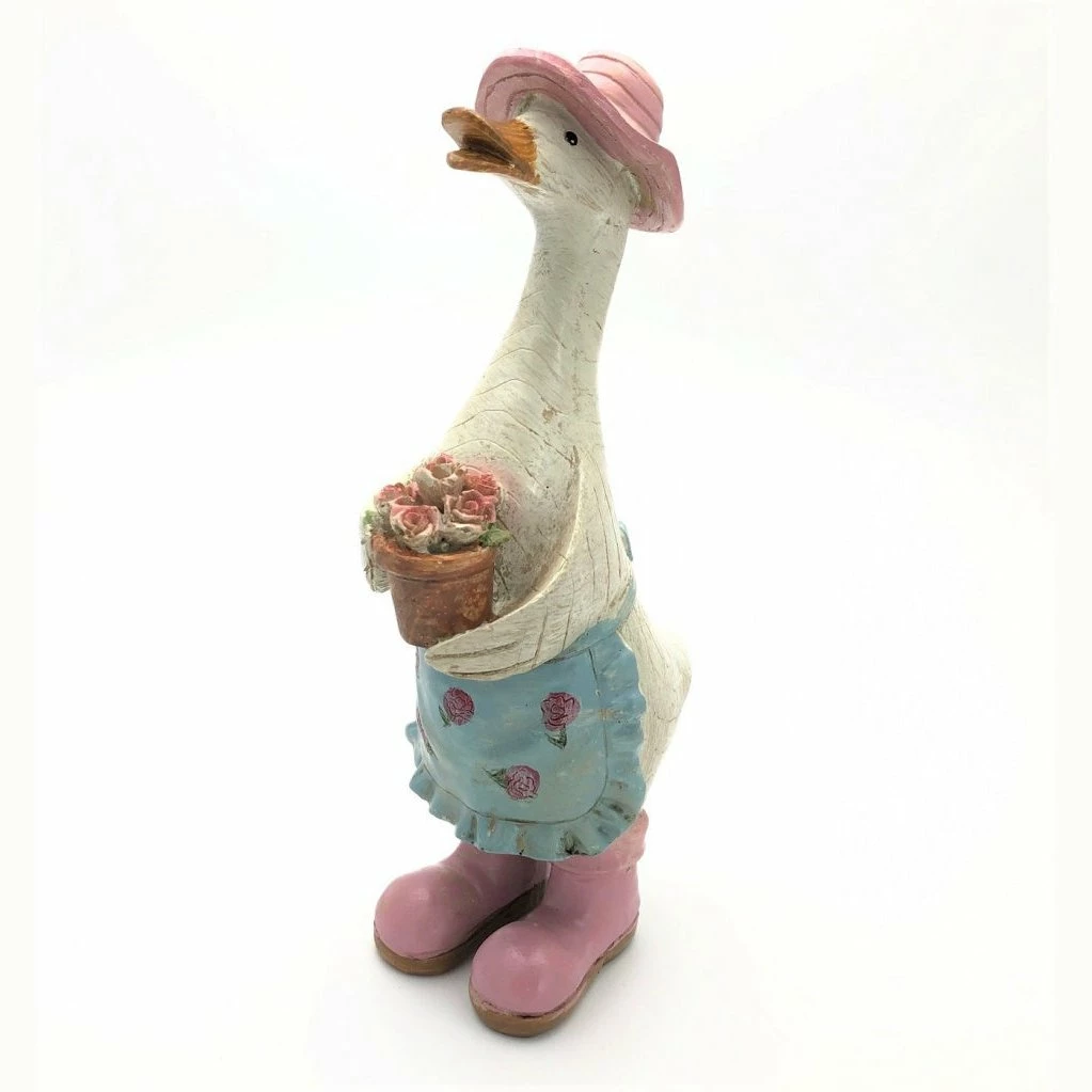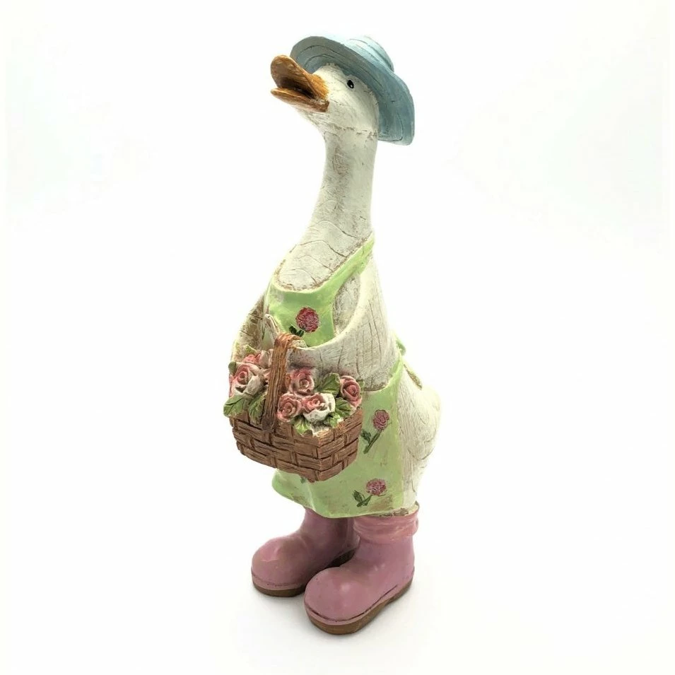 - One duck has a plant pot full of roses, one has a spade and one has a basket full of flowers