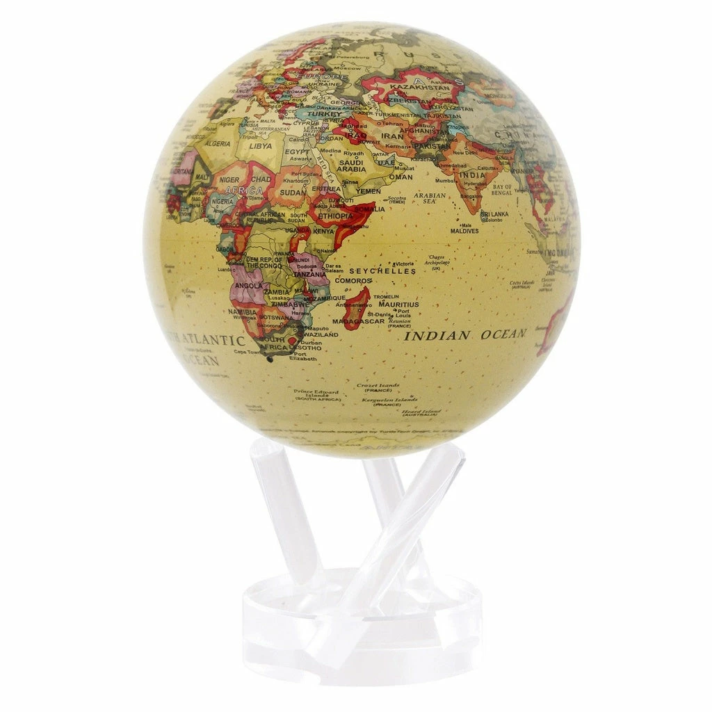 These globes really are something special with almost hypnotic spinning; silent and marvellous. The detail of the map defines the land masses and countries in a lovely antique colouring. The landmasses pair against soft, yellow oceans and