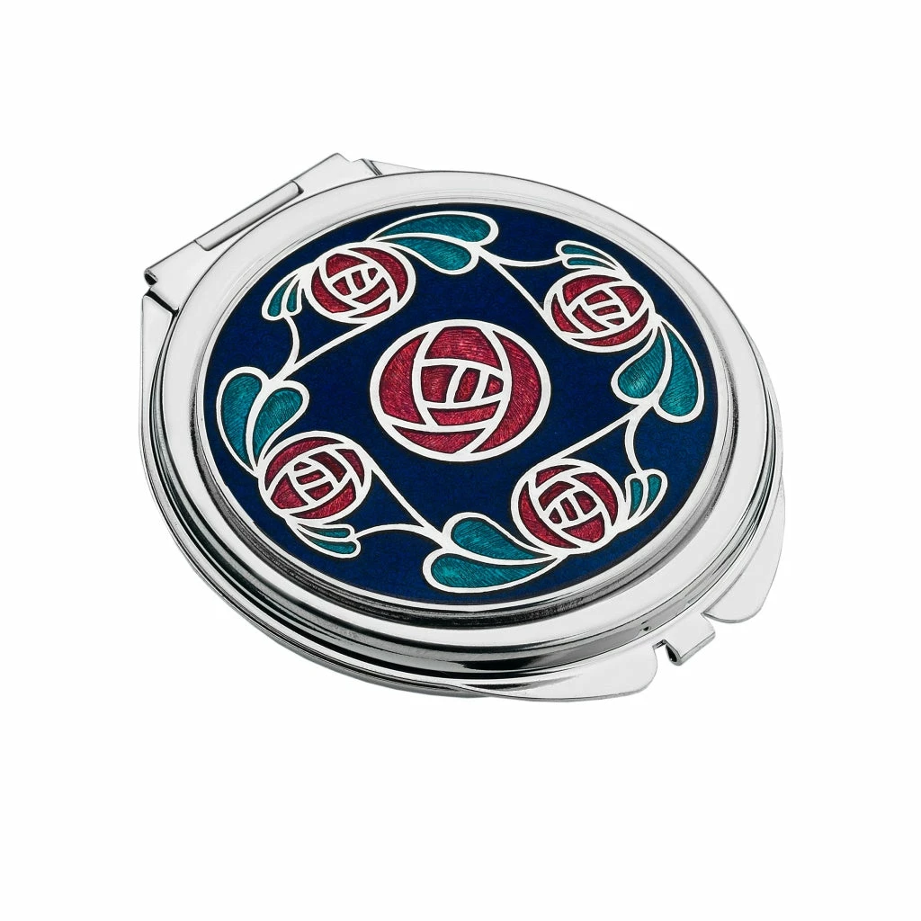 - Stunningly beautiful enamelled pewter compact mirror, the lid is decorated with Mackintosh’s iconic rose design in blue and red
