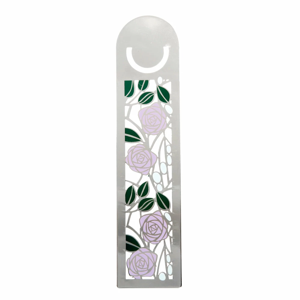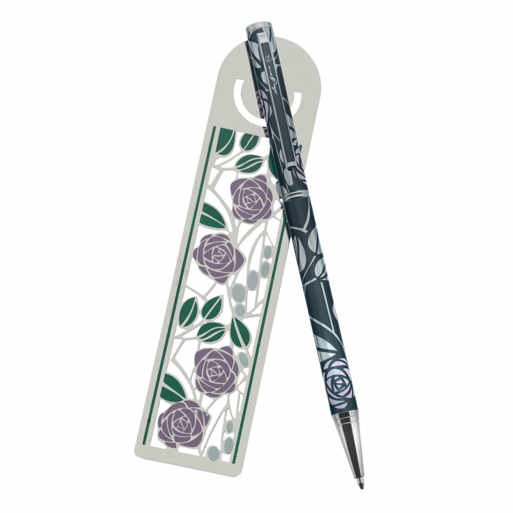 Set comprises slim line ball point pen and large bookmark- The metal bookmark features a 4 mackintosh roses in pink with leaves