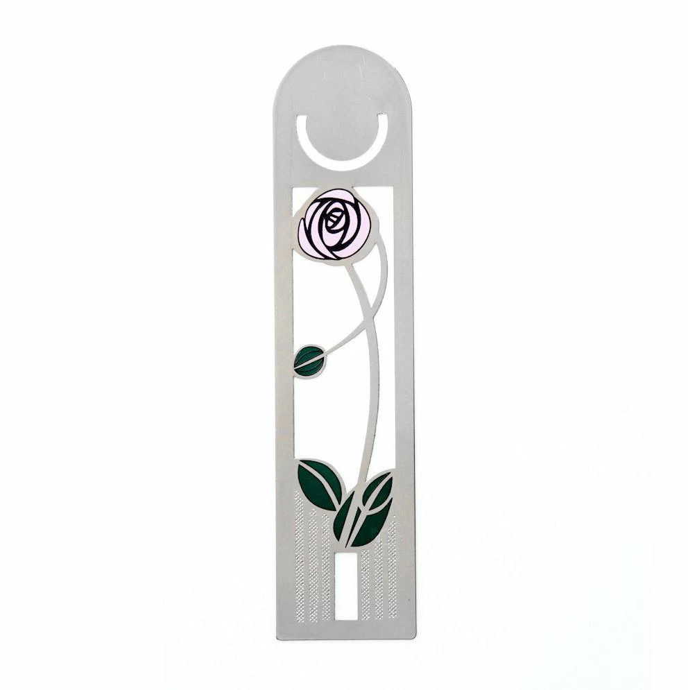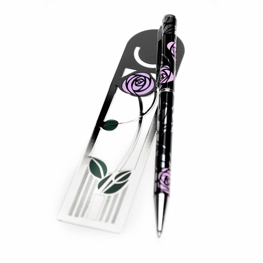 Set comprises slimline ball point pen and large bookmark- The metal bookmark features a mackintosh rose in pink with leaves and a flower bud