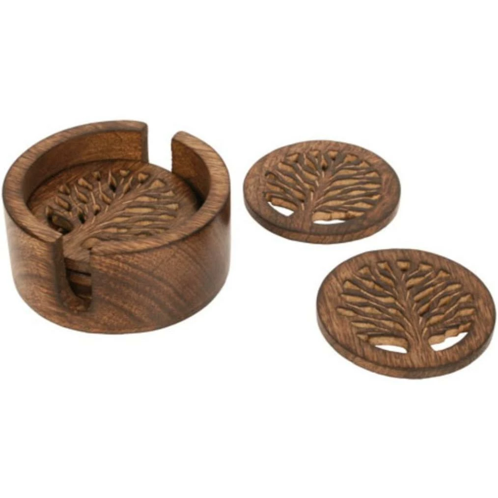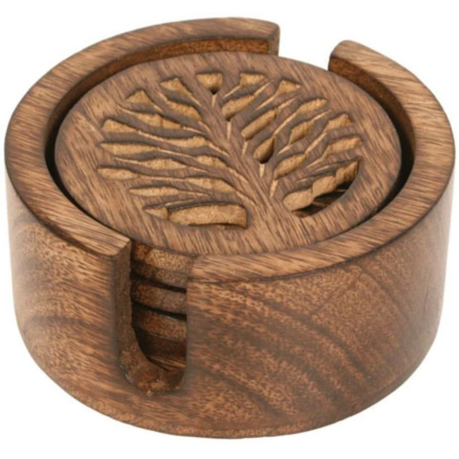 Hand carved mango wood coasters with tree of life design in their own wooden holder